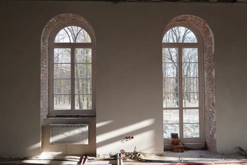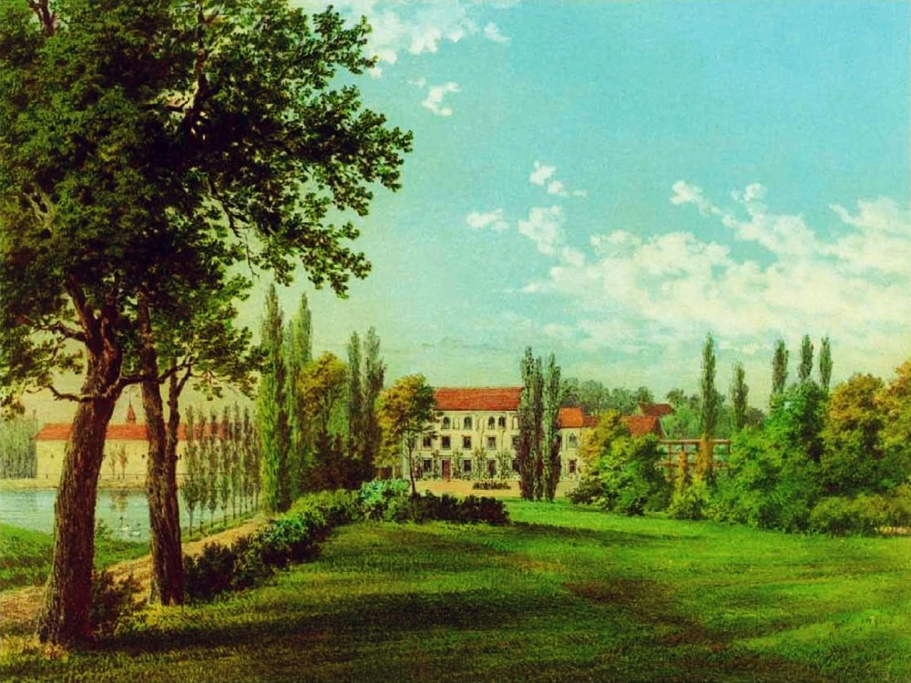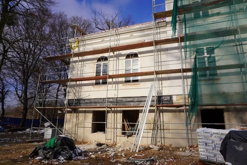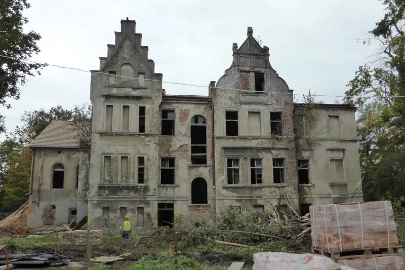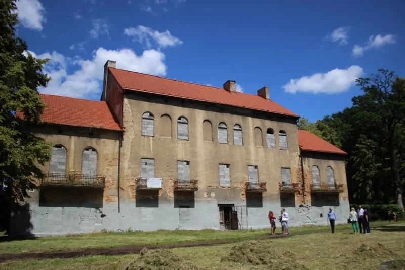 Pałac postawiono na rzucie prostokąta. Budynek główny jest trzykondygnacyjny, a po bokach znajdują się jednopiętrowe przybudówki. Fasadę północną zdobią czterokondygnacyjne ryzality z dekoracyjnymi szczytami. Przylega do niego rozległy park, w którym rośnie kilkadziesiąt dębów będących pomnikami przyrody.