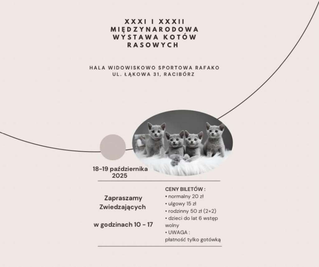 18 i 19 października hala widowiskowo-sportowa przy ul. Łąkowej 31 w Raciborzu stanie się miejscem XXXI i XXXII Międzynarodowej Wystawy Kotów Rasowych. Wydarzenie odbędzie się w godzinach 10:00-17:00. Co czeka na odwiedzających? Podczas wystawy będzie można podziwiać koty wielu ras z Polski i z zagranicy, porozmawiać z doświadczonymi hodowcami, zdobyć wiedzę na temat pielęgnacji i charakteru poszczególnych ras oraz skorzystać z oferty stoisk z bogatym asortymentem produktów dla kotów (m.in. karmy, drapaki, legowiska, akcesoria).