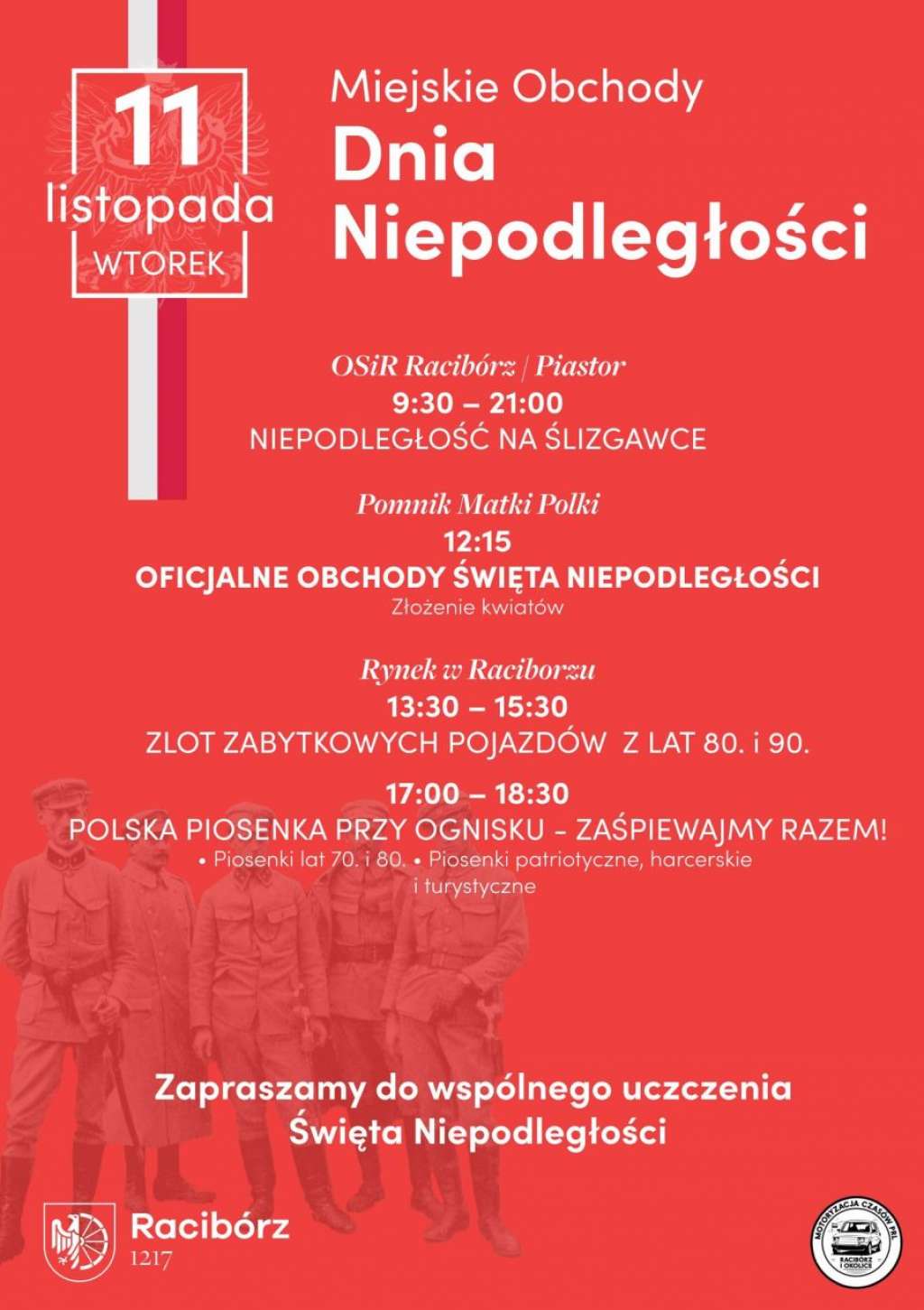 Popołudniowe i wieczorne atrakcje skoncentrowane będą na rynku w Raciborzu. W godz. 13:30-15:30 odbędzie się zlot zabytkowych pojazdów z lat 80. i 90., który będzie motoryzacyjną podróżą w czasie dla pasjonatów. Dzień zakończy się wieczornym spotkaniem w rodzinnej atmosferze. W godz. 17:00-18:30 mieszkańcy będą mogli wziąć udział w akcji „Polska Piosenka Przy Ognisku – Zaśpiewajmy Razem!”, podczas którego wspólnie zaśpiewane zostaną znane i lubiane utwory, w tym piosenki patriotyczne, harcerskie i turystyczne.