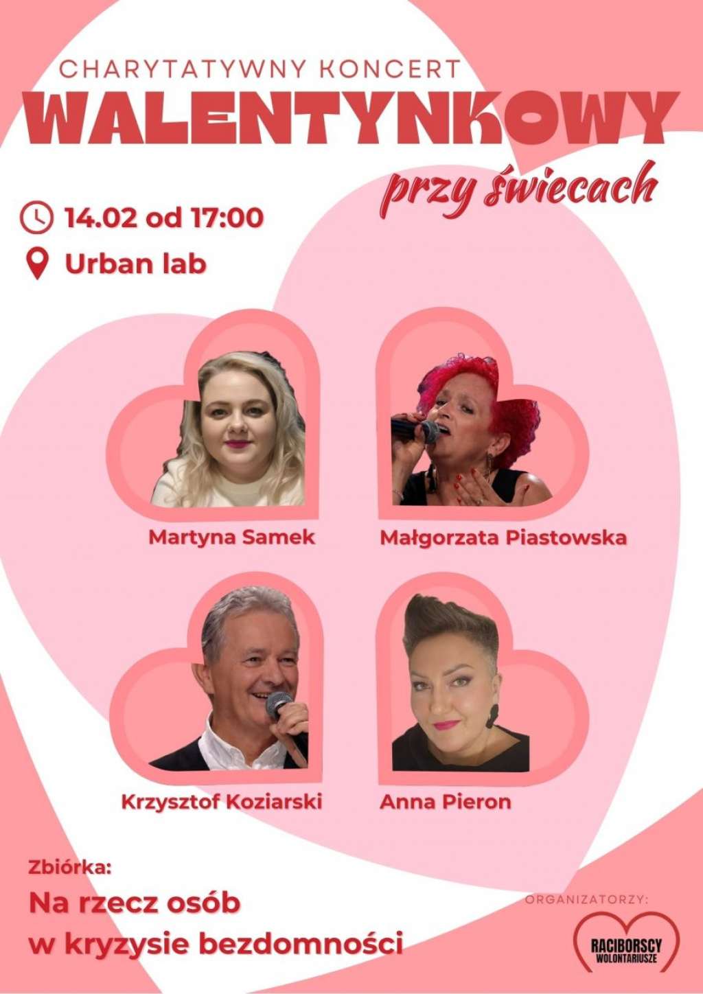 Stowarzyszenie Raciborscy Wolontariusze przygotowało specjalne wydarzenie łączące świętowanie dnia zakochanych z realnym wsparciem dla osób najbardziej potrzebujących. 14 lutego o godz. 17:00 w przestrzeni Urban Labu przy Pl. Dworcowym 1 w Raciborzu odbędzie się charytatywny koncert walentynkowy przy świecach. Organizatorzy zaplanowali wieczór w kameralnej oprawie, z którego całkowity dochód ze zbiórki zostanie przekazany na pomoc osobom doświadczającym bezdomności.